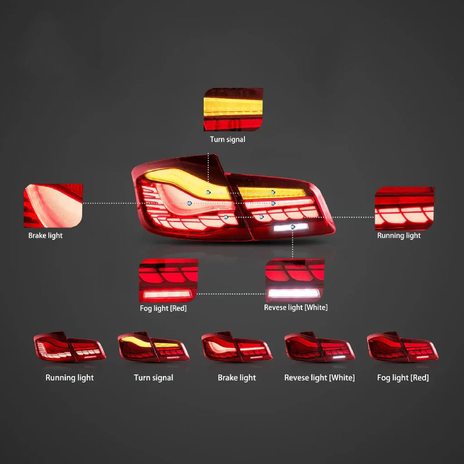 RDX GTS style LED smoked tail lights offer a premium upgrade for BMW 5 Series. Featuring dynamic sequential indicators and welcome dynamic lighting, these tail lights combine advanced LED technology with a sleek smoked finish, providing improved aesthetics and safety with easy plug-and-play installation.